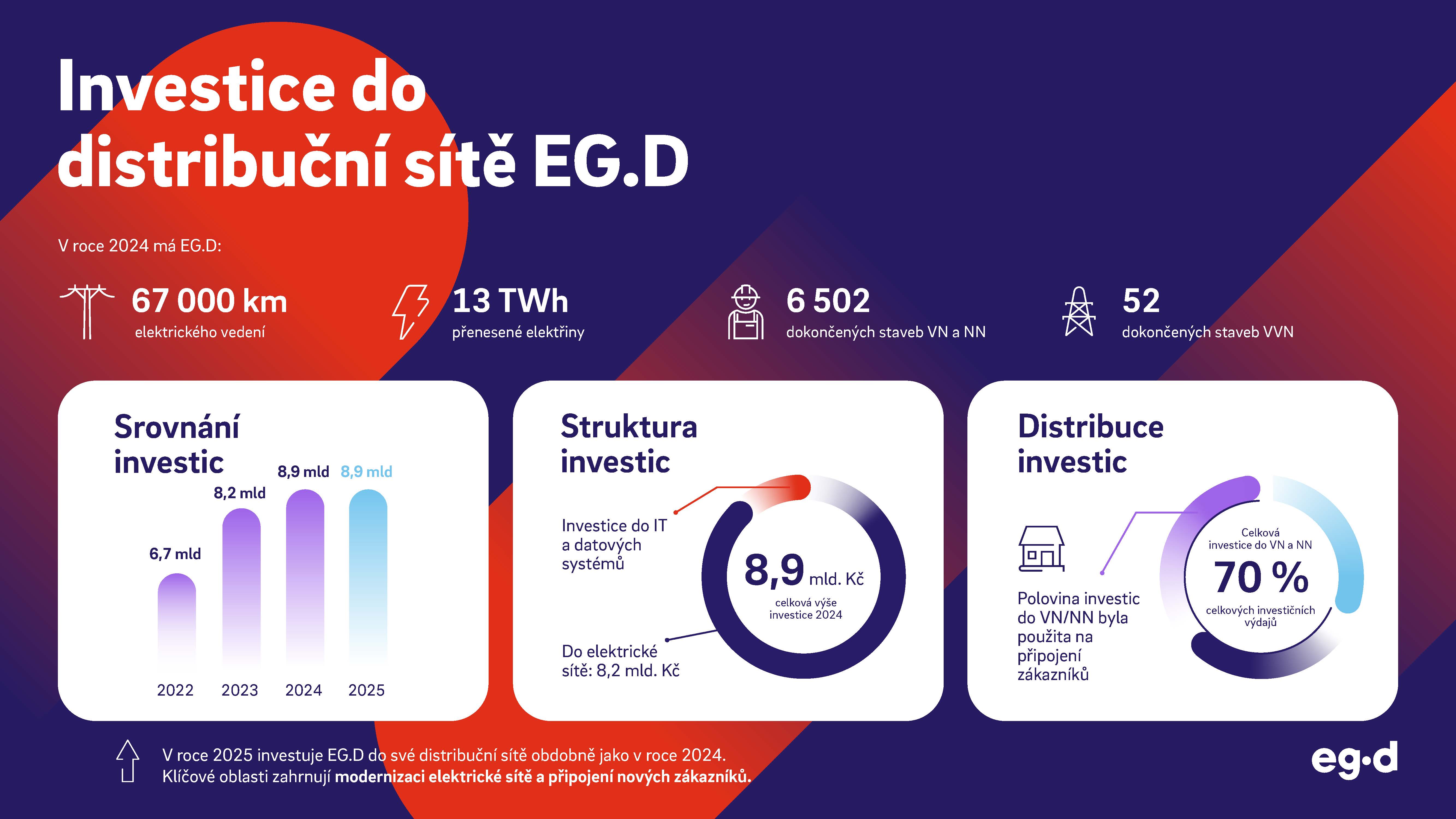 Vloni distribuční společnost EG.D, člen skupiny E.ON, investovala do modernizace a rozvoje distribuční sítě 8,9 miliard korun. Podobný objem investic plánuje i pro letošní rok 2025. Velká část těchto prostředků směřuje do posilování sítě. Největší část prostředků je určena na modernizaci distribuční sítě, zlepšení její spolehlivosti a připojování nových obnovitelných zdrojů. Mezi hlavní investice patří posilování vedení v příhraničních oblastech a strategické projekty na hladině velmi vysokého napětí.