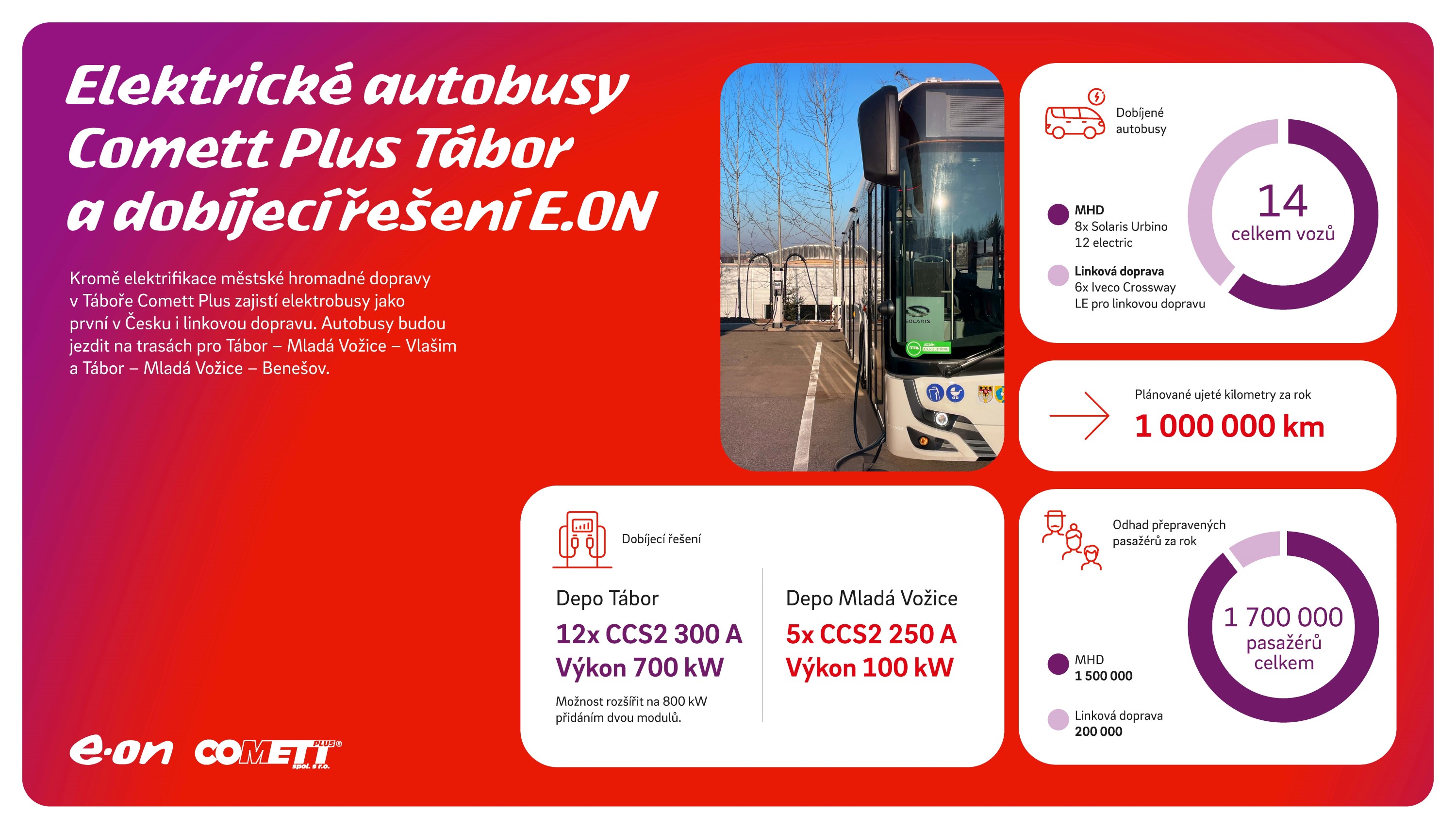 Už přes dva měsíce jezdí po Táboře osm plně elektrických autobusů, které doplňuje dalších šest vozů na linkách mezi Jihočeským a Středočeským krajem. Společnost Comett Plus tak zajišťuje v pilotním projektu linkovou dopravu elektrickými vozidly jako první v České republice. Za rok by elektrická vozidla měla urazit dohromady téměř milion kilometrů a převést více než 1,7 milionu cestujících. Klíčovou infrastrukturu pro dobíjení elektrobusů navrhla a postavila společnost E.ON Energie.